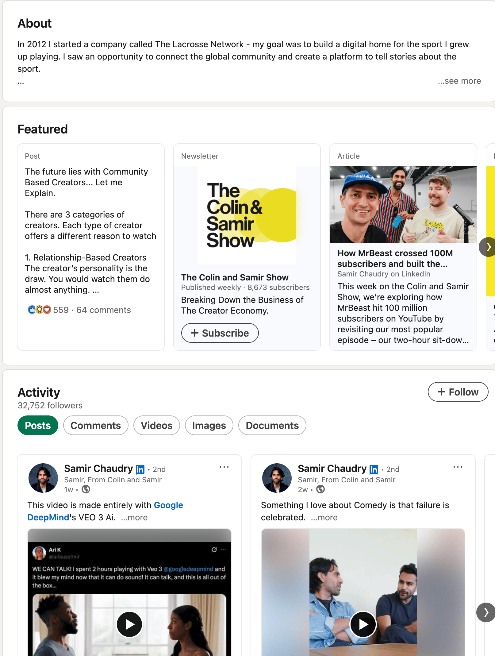 2/ Get rid of the descriptions on your featured posts If you keep the descriptions, you add a lot of friction. Instead of going directly to the source, it opens a second page, where there's a teeny-tiny button to visit the site. Remember - LinkedIn wants to keep you on LinkedIn. They're not incentivized to help you get your traffic to your website. So...lower the friction by eliminating descriptions. 3/ Post more often From a "what do I get if I follow this account" perspective, posting daily > posting weekly. More value for zero extra effort. So in terms of profile conversion, posting more is better. Upgrades to his content1/ Post more I know I just said this, but this time I'm saying it from a traffic standpoint. If you post 7x per week, you will get 5-7x the traffic than if you post 1x per week. Sometimes there's a little drop in impressions or engagement per post, but you'd still likely see a 5x increase in impressions and engagement (and potentially more if the quality stays high or even increases). 2/ Embrace LinkedIn native content Samir is mostly posting video clips. Now, that's not an issue. Video performs well on LinkedIn. BUT LinkedIn is not Instagram, where reels stand alone. On LinkedIn, you need the text-based context. Most users get on the platform to read, not scroll mindlessly like they do on many other platforms. 3/ More text-based content This goes along with the last point. But take a look—when he's used text-based posts with some supporting images, the content has performed well: Now, I'm not saying he should stop posting the videos he is. But as he scales from 1x per week to 7x per week, I'd recommend using 2 of those for videos and 5 of those for text + image posts. 4/ Engage with the big creators on LinkedIn Samir has a great relationship with many of the big creators—especially on YouTube. But he hasn't tapped into the LinkedIn ones at all. He's a few YouTube interviews away from having all the biggest LinkedIn accounts consistently commenting on his posts. High-level takeaways for you and meOkay, let's be real... Samir is in a unique position. He can leverage the biggest creators' audiences to bolster his own. Not to mention the automatic flywheel he gets from having a massive audience on other platforms. But, there are a few things we can take away. Here're mine: