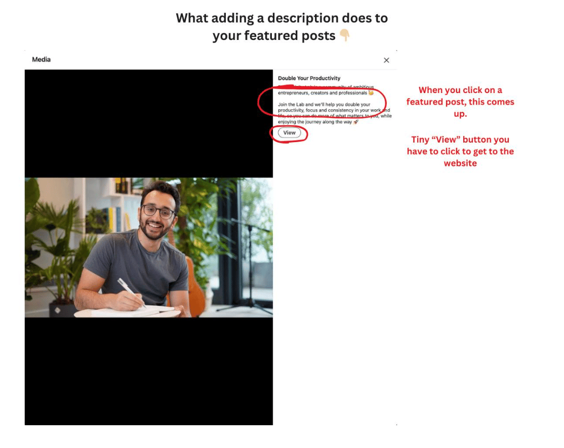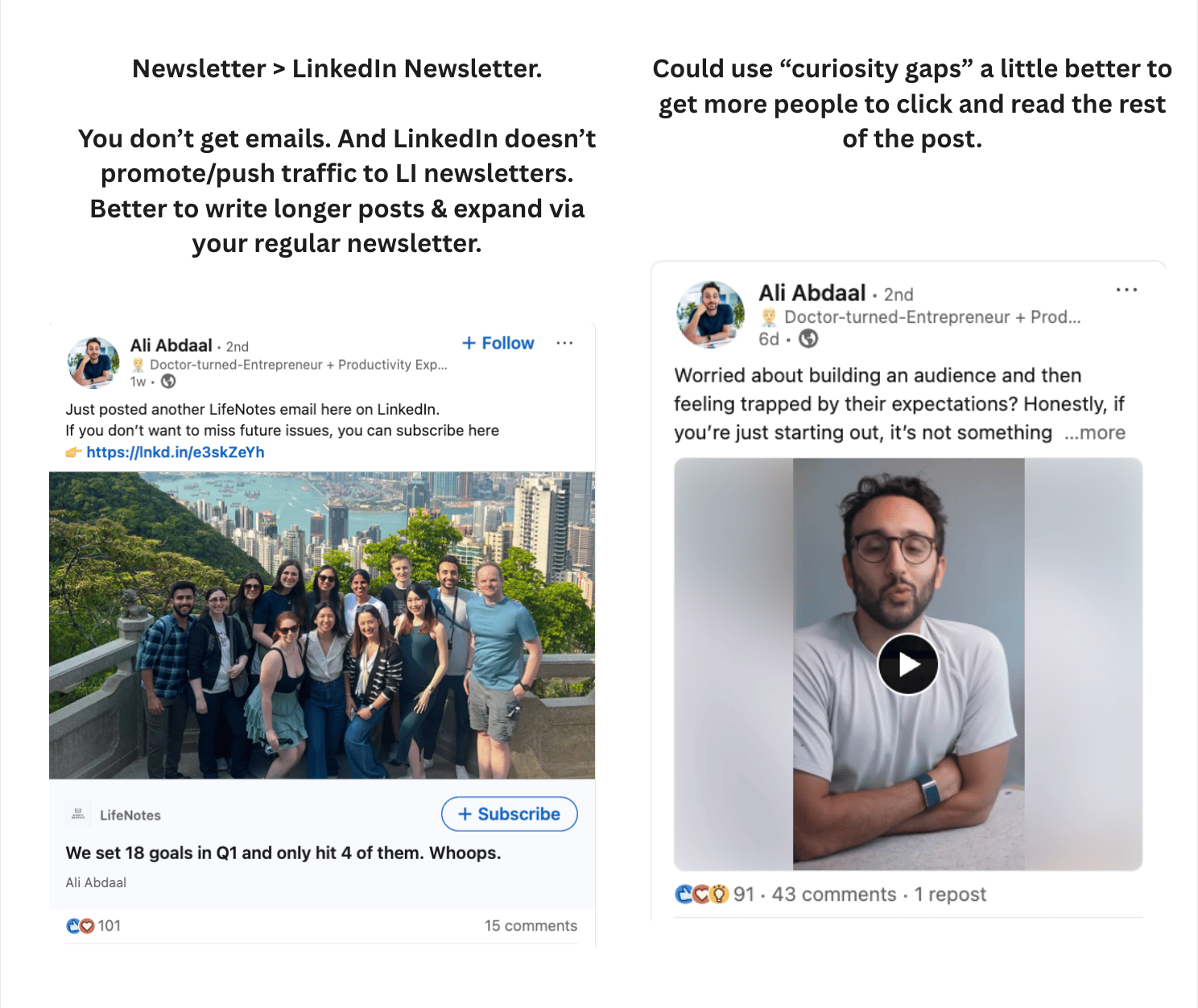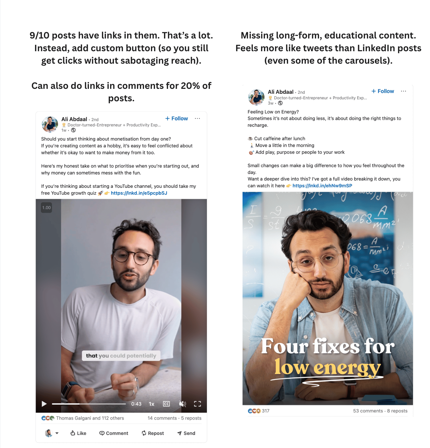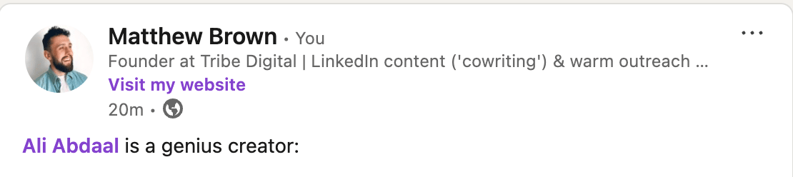 Hey! Matthew here. This week, I spent a few hours analyzing Ali Abdaal's LinkedIn account, funnel, profile, and other social profiles. My summary: He's a genius creator. BUT.... He's leaving a lot of followers, subscribers and revenue on the table. Because his LinkedIn could use some big upgrades. Let's dive in, shall we? Profile UpgradesLet's take a closer look. Here are 10 aspects of his profile worth mentioning: 1. Banner ✅ - could potentially add a little extra credibility. Something like "NY Times Bestseller" and/or "6M YouTube subscribers". But he could be more explicit with who he helps (and how) so that you know what you're getting by following him. One other small note: he made "follow" primary. Which is great. Example below (see the "visit my website" link?): 8. About section ✅ - really solid. Small upgrade would be switching "videos" to "content" - we're on LinkedIn, not YouTube. 9. Featured section - another major upgrade. Get rid of the descriptions. They make the reader 2-click. 10. Post frequency - 6-day gap. I think this was one-off, but worth calling out regardless. 8 Major Content UpgradesNow, let's move to content: 3. 90% of his posts have links - use on 50% instead (won't sabotage reach as much). On the other 50% use the custom button link OR link in comments. You lose a lot of reach when you include a link in every post. 5. Uses LI newsletter (instead of newsletter) - LinkedIn doesn't promote newsletter very much. Just make a longer post. Then link to your newsletter. If LinkedIn were driving traffic to LI newsletters, I'd say go for it. But it's not prioritized. 7. People love the personal content - lean in more. You've got signal. More build-in-public, lifestyle posts. Other Insights & NotesAs I was doing research, I did notice a few other things. You can see the video versions by clicking here. Or just read this bulleted list: