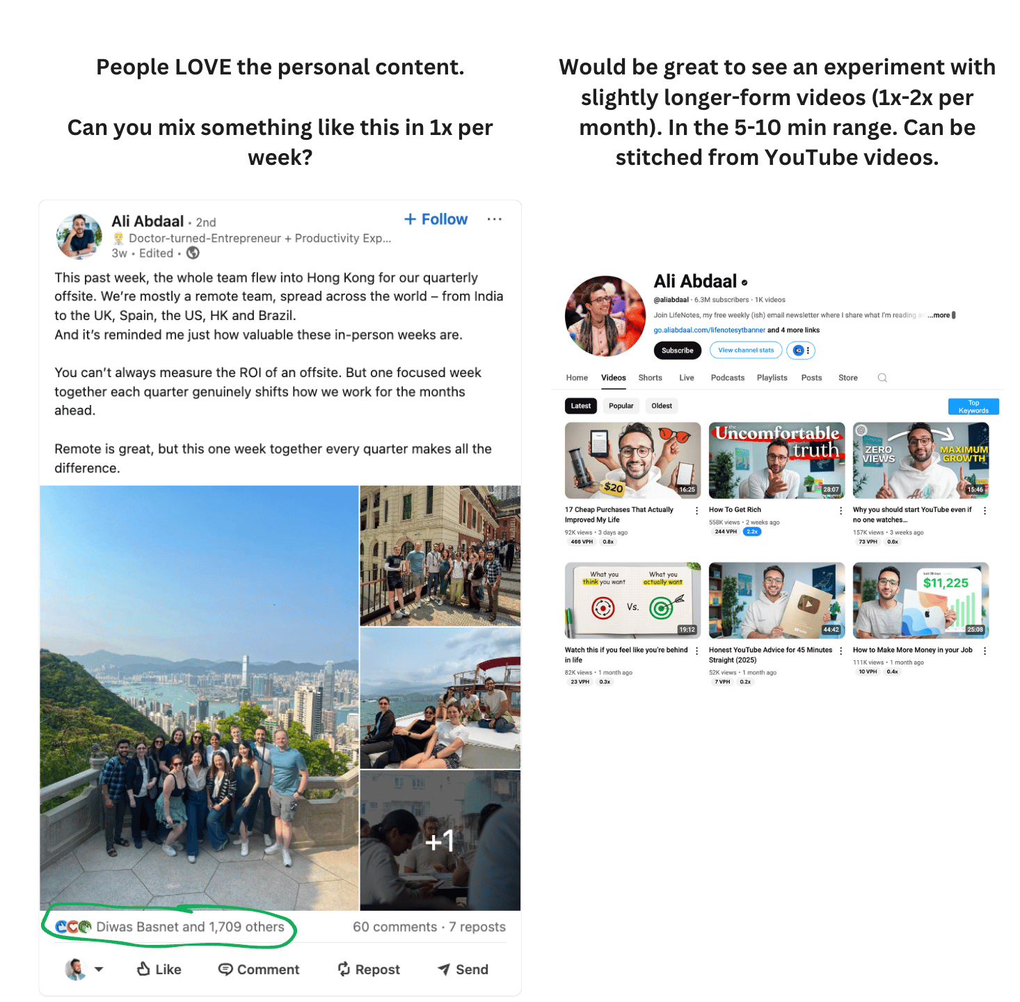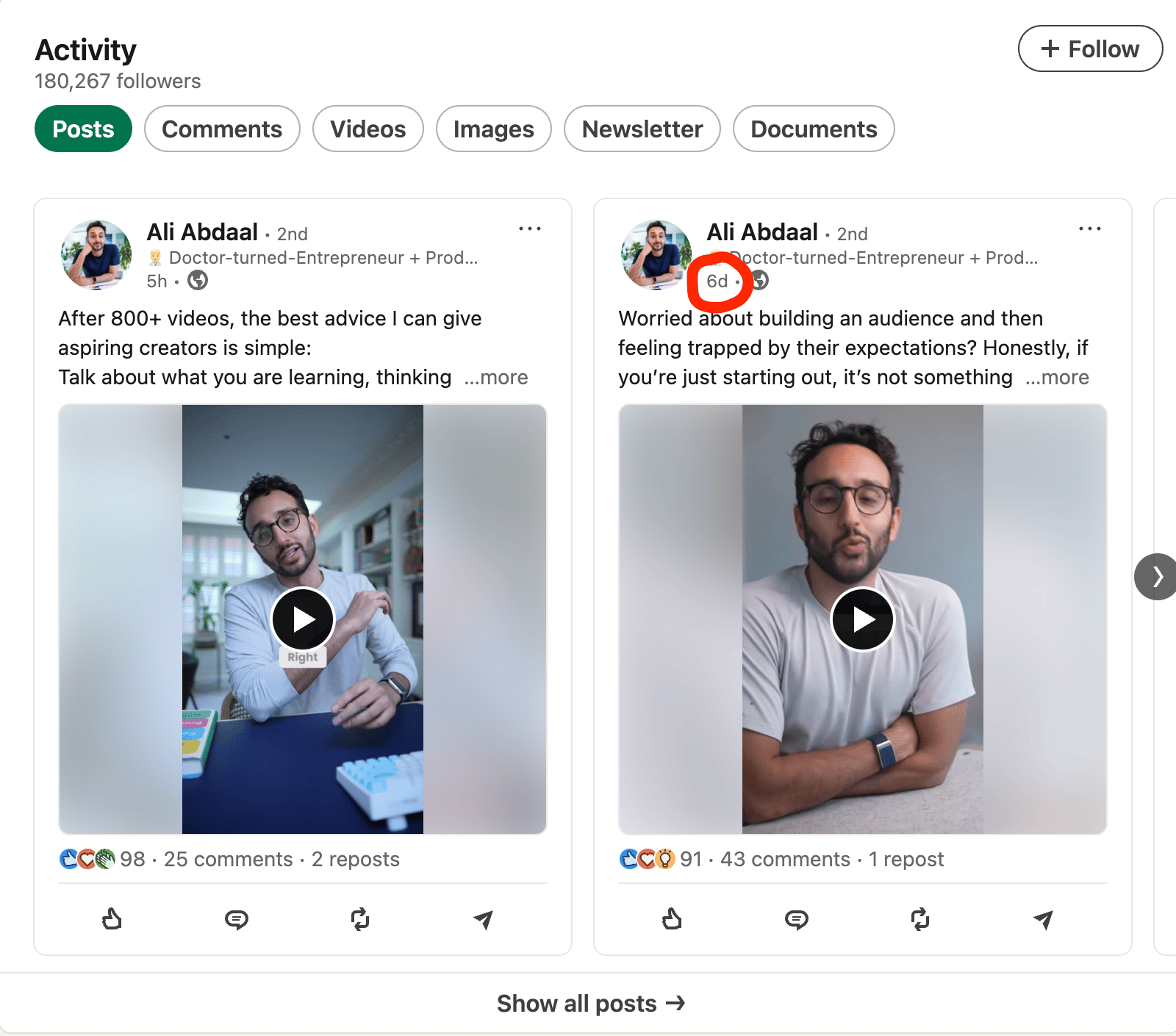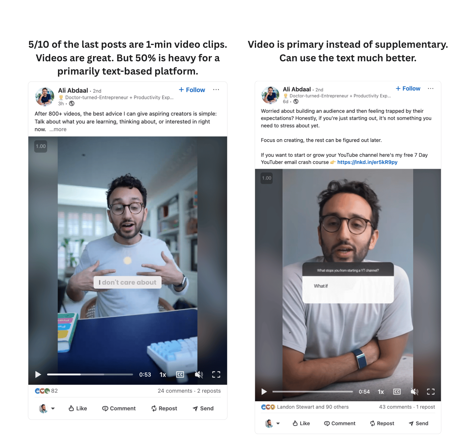 Hey! Matthew here. This week, I spent a few hours analyzing Ali Abdaal's LinkedIn account, funnel, profile, and other social profiles. My summary: He's a genius creator. BUT.... He's leaving a lot of followers, subscribers and revenue on the table. Because his LinkedIn could use some big upgrades. Let's dive in, shall we? Profile UpgradesLet's take a closer look. Here are 10 aspects of his profile worth mentioning: 1. Banner ✅ - could potentially add a little extra credibility. Something like "NY Times Bestseller" and/or "6M YouTube subscribers". But he could be more explicit with who he helps (and how) so that you know what you're getting by following him. One other small note: he made "follow" primary. Which is great. Example below (see the "visit my website" link?): 8. About section ✅ - really solid. Small upgrade would be switching "videos" to "content" - we're on LinkedIn, not YouTube. 9. Featured section - another major upgrade. Get rid of the descriptions. They make the reader 2-click. 10. Post frequency - 6-day gap. I think this was one-off, but worth calling out regardless. 8 Major Content UpgradesNow, let's move to content: 3. 90% of his posts have links - use on 50% instead (won't sabotage reach as much). On the other 50% use the custom button link OR link in comments. You lose a lot of reach when you include a link in every post. 5. Uses LI newsletter (instead of newsletter) - LinkedIn doesn't promote newsletter very much. Just make a longer post. Then link to your newsletter. If LinkedIn were driving traffic to LI newsletters, I'd say go for it. But it's not prioritized. 7. People love the personal content - lean in more. You've got signal. More build-in-public, lifestyle posts. Other Insights & NotesAs I was doing research, I did notice a few other things. You can see the video versions by clicking here. Or just read this bulleted list: