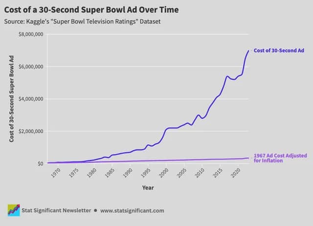 Content is the *only* advertising method that gets less expensive to reach more people over time. Paid Ads: Paid ads are highly effective and will continue to be. The downside is the costs look like this over time (whether we're looking at Super Bowl ads or Facebook ads) 👇🏼 That's how Facebook and Google keep growing ever year. More users + higher CPCs and CPMs for ads. But here's why they're so effective: