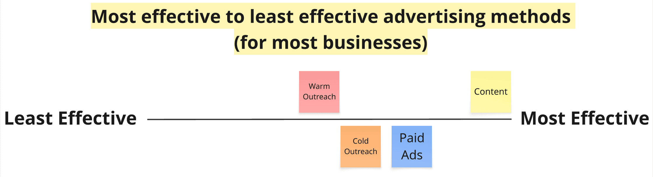 It's time consuming to create and takes a while to reap the rewards. Most effective to least effective advertising methods (for most businesses)Note: there's so much nuance here, you could make rational arguments for different orders. But let's define "effective for most businesses": you the same amount of inputs into a system over a long period, each method produces a different volume of outputs. Most effective = most outputs. Content:Content is the most effective, long-term advertising method. Here's why: